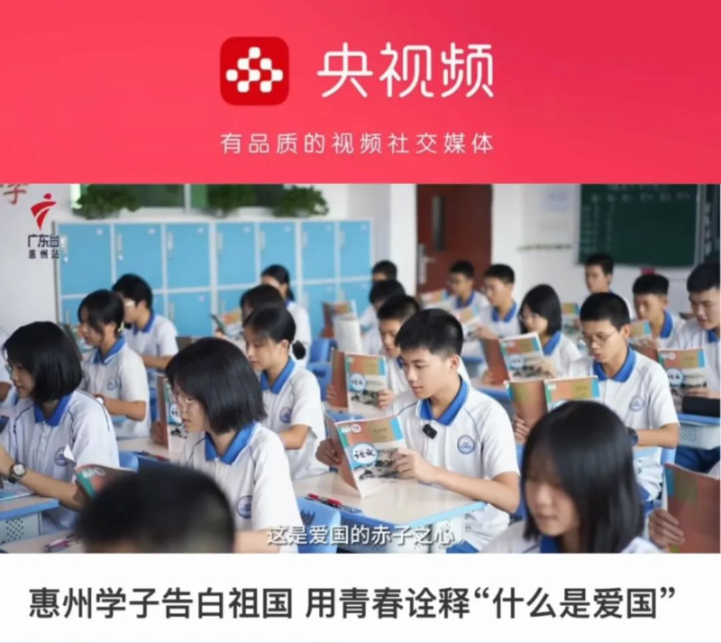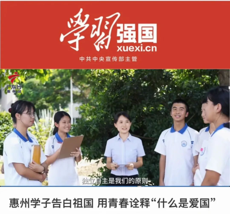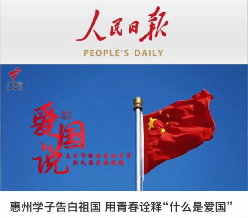 今年中秋国庆双节同庆之际,惠州综合高中献礼国庆节的短视频《爱国说》登上《人民日报》新媒体平台“人民号”、中央电视台新媒体平台“央视频”和“学习强国”学习平台等中央级媒体以及腾讯新闻、百家号、大鱼号等新媒体平台。